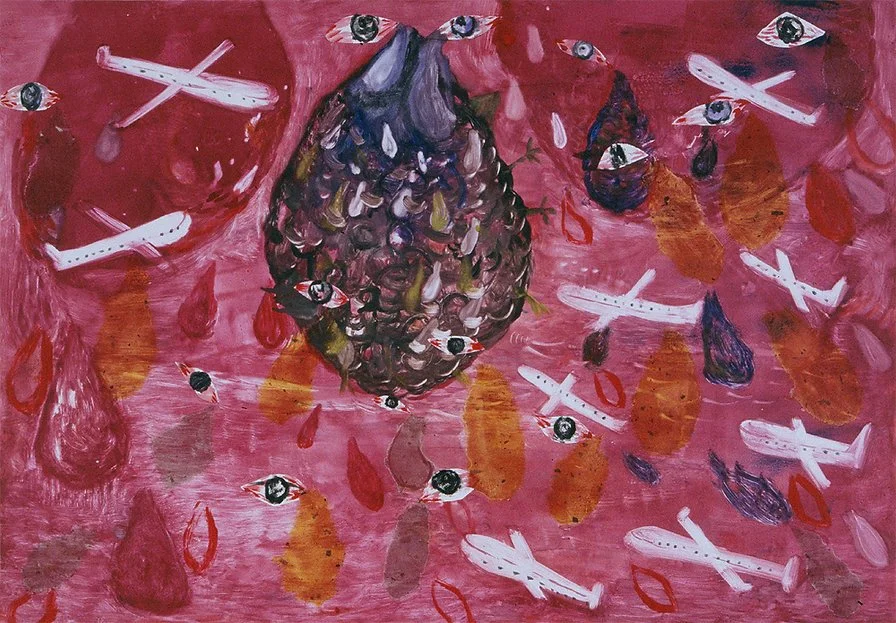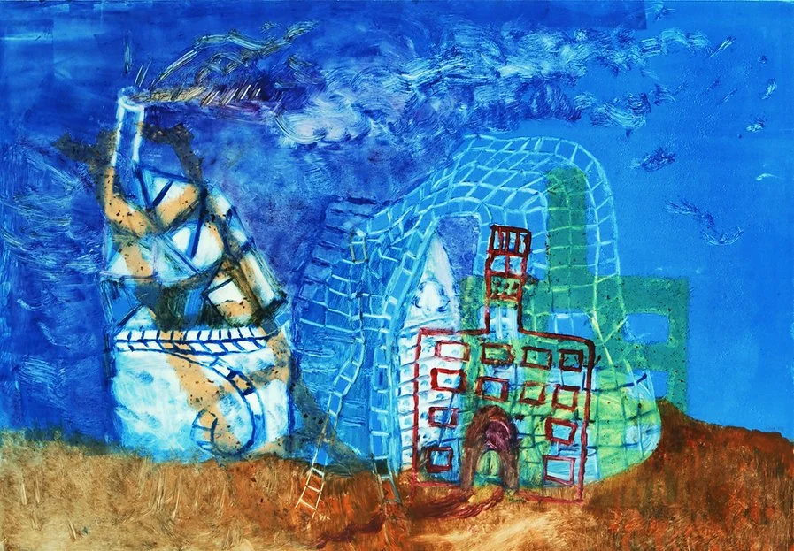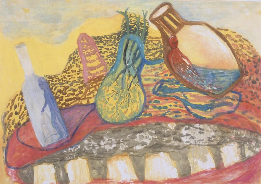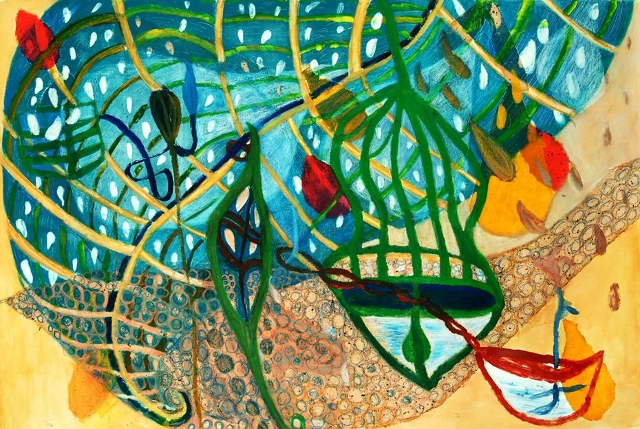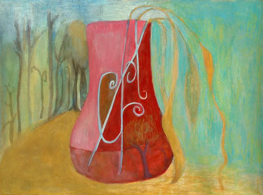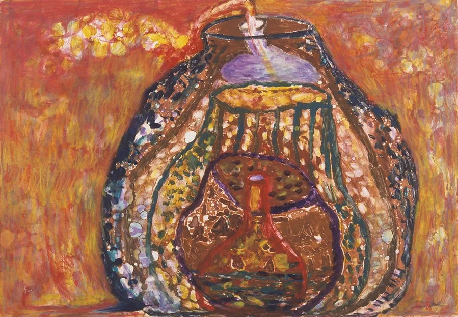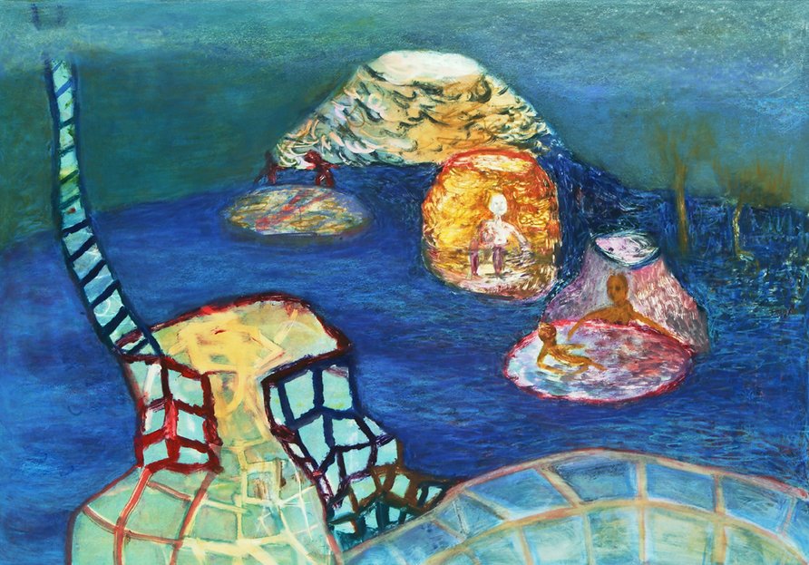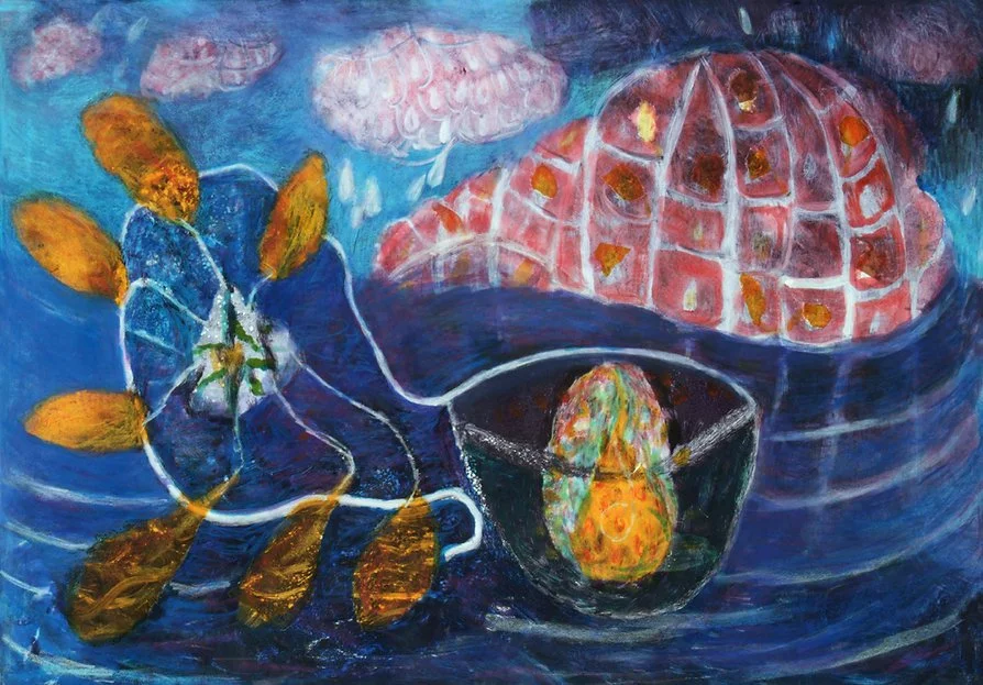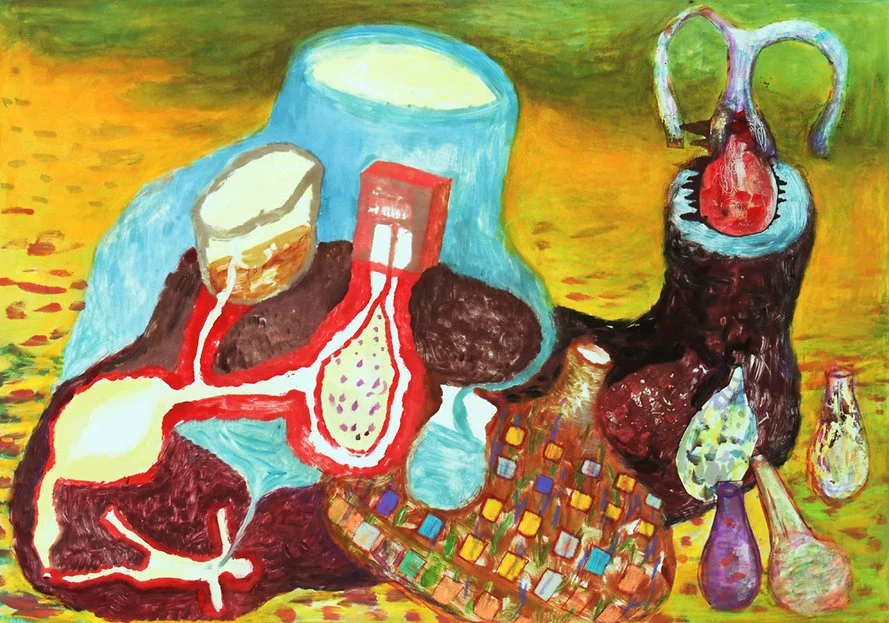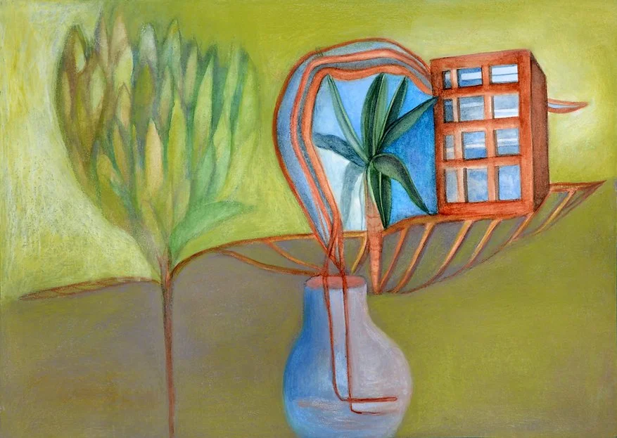 Constantly relocating, I began to visualized home as a place under my skin: a landscape of organs and cells, which led to an awareness of myself as a freer being, yet trapped in the body. This series about enclosures (home, body, vessel, bottle, womb) explores our concurrent drive to be contained and break free.