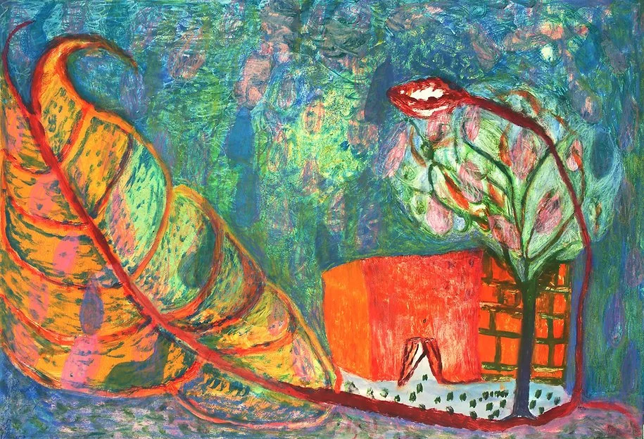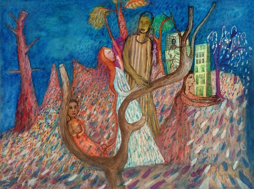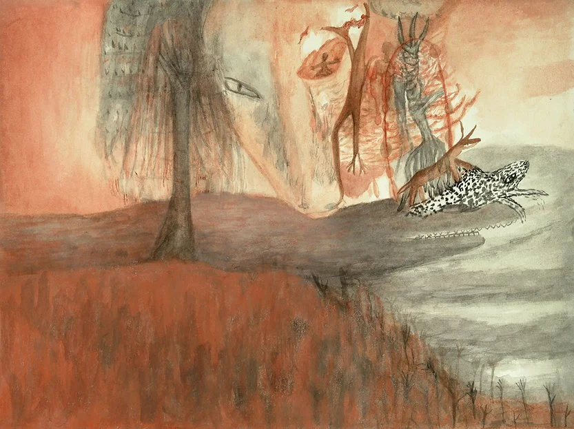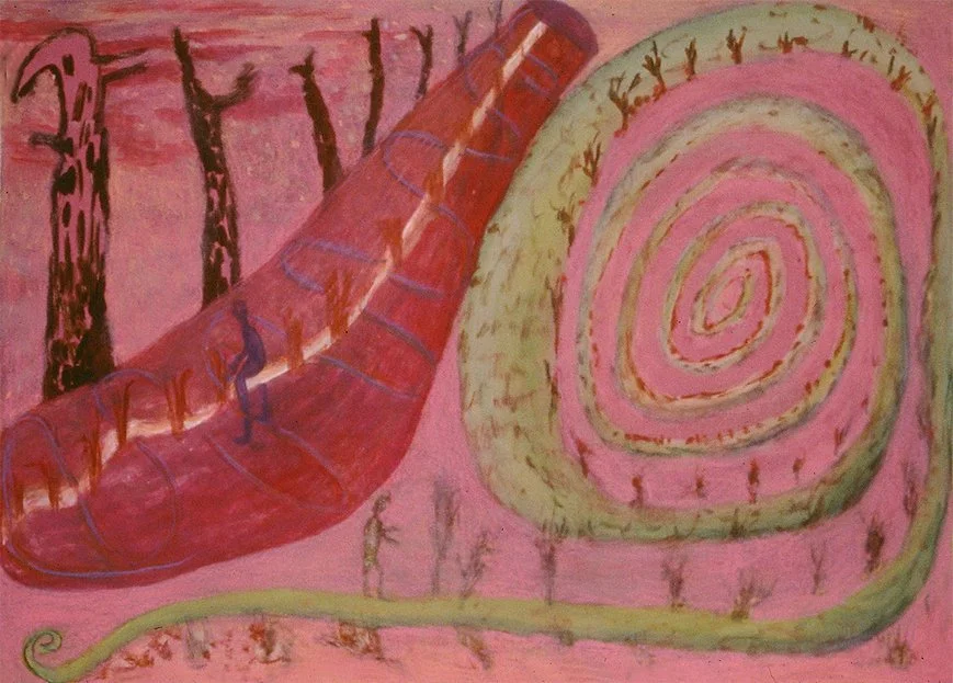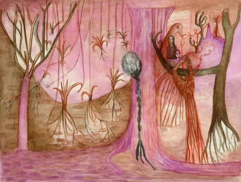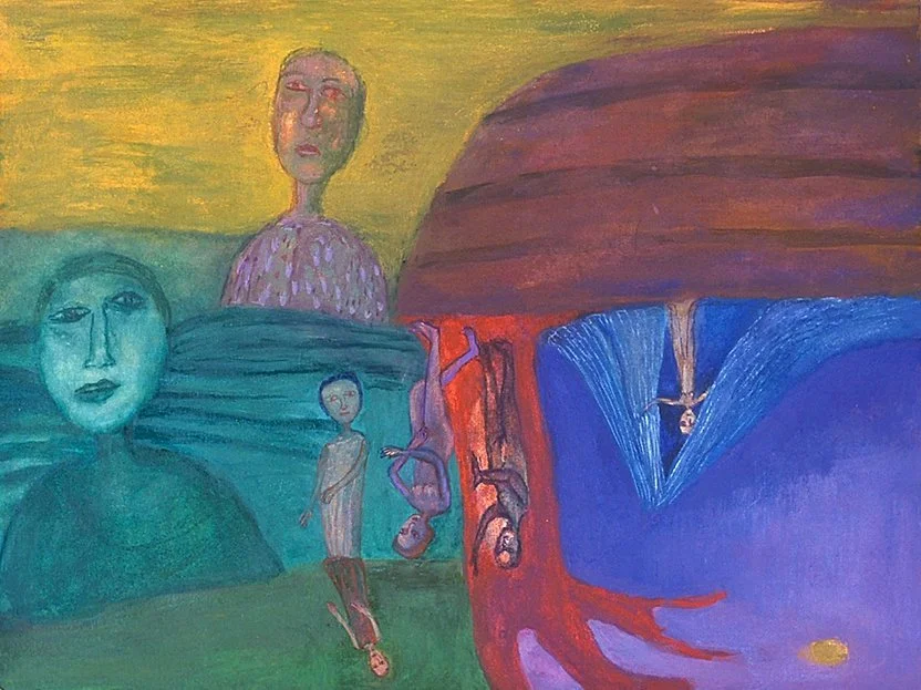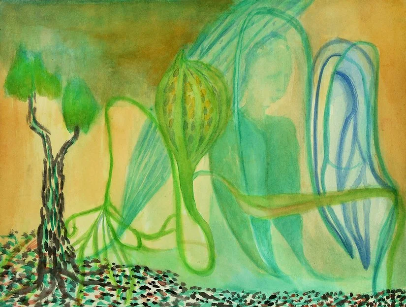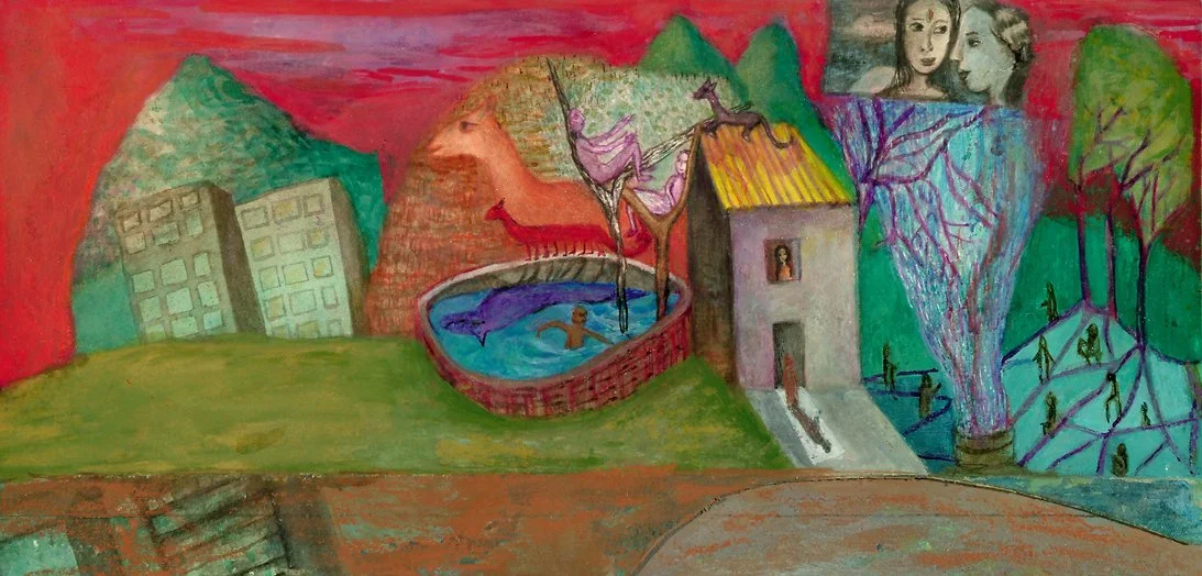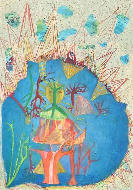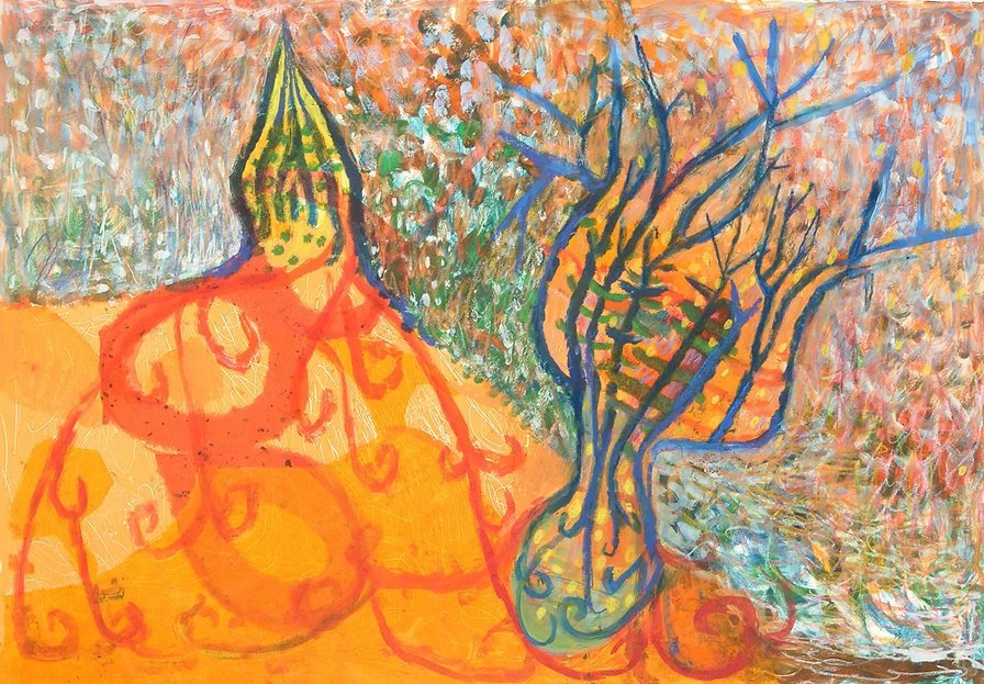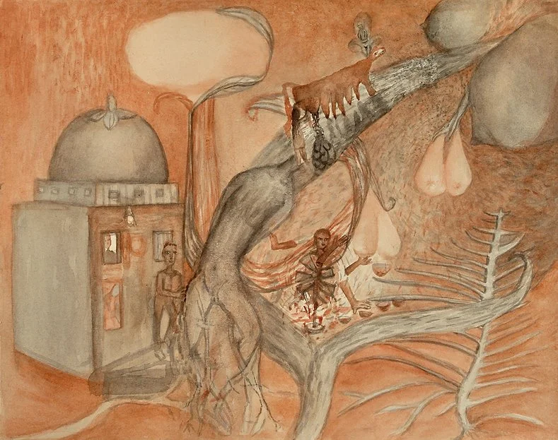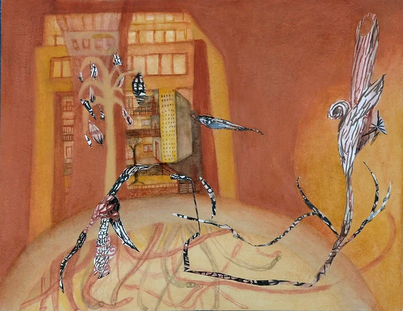 In 2007, I returned to small-scale watercolors with imagery inspired by recent oil-based paintings, but soon the pictures developed a subtler, more detailed and whimsical imagery, of make belief people and animals set in an enchanted or menacing womb-like landscape.